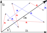 where a1 ... an are the vectors to be added together, i1 ... in are their horizontal components, j1 ... jn are their vertical components, and θ is the angle between the θ=0 line and the resultant vector Σan, as shown in the diagram on the right.