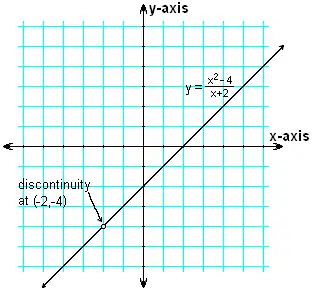 y-intercept ordinate of -2. So for the final answer , we graph a line with a slope of 1 and a y-intercept of -2, and we show a discontinuity at x = -2, where y would otherwise have been equal to -4.