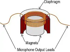 The first conductor arrangement has a moving coil of wire. The wire is typically copper and is attached to a circular membrane or piston usually made from lightweight plastic or occasionally aluminum. The impinging pressure fluctuation on the piston causes it to move in the magnetic field and thus creates the desired electrical current.