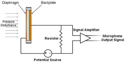 Condenser microphones convert pressure fluctuations into electrical potentials by changes in electrical capacitance, hence they are also known as capacitor microphones. An electrical capacitor consists of two charged electrical conductors placed at some relatively small distance to each other. The basic relation that describes capacitors is: