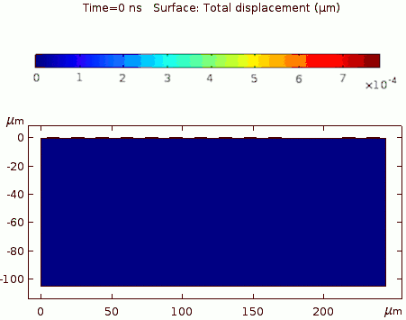 The animation below is time-domain simulation for the 2D structure of SAW device using COMSOL. The x,y-axis represent the position of model. The small rectangles on top are electrodes.
