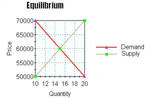 Since the demand curve slopes down and the supply curve slopes up, if they are put on the same graph, they eventually cross one another. Graphically, this consists of superimposing the two graphs that we have; at the point where the two lines, the supply line and the demand line, meet, is called the equilibrium point for the good. To return to our example of houses; in the end, if the equilibrium point for the house price is $60,000, everyone who wants to buy on that price will find a house, and everyone who wants to sell on that price will find a buyer.