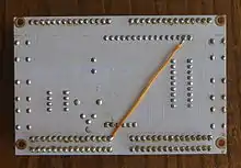 The LCD display board is run by a PIC 16F84 microcontroller, which is a low-power processor running a program written by Simplemachines that talks to the Ampire 162B LCD panel, detects button presses and communicates with the main AVR32 processor over the I2C bus.