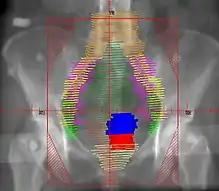 Example of a lateral radiation therapy treatment field for Stage IB2+ Cervix used at Tufts/Brown residency program. Actual patient contours should guide field design and AP/PA vs. 4F decision.