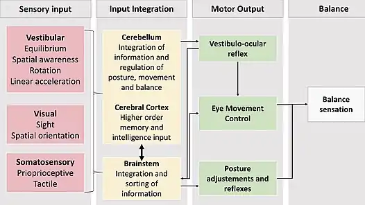 The human balance control requires the collective efforts of sensory and central nervous system (CNS), and the human body to work against the external disturbances such as gravity; any changes in multisensory inputs will trigger immediate alterations in CNS so as to maintain balance. More importantly, such alterations are a result of estimations of the unforeseen scenarios based on changes in multisensory inputs. This intriguing control behavior has inspired neurologists and engineers with models to explore the myths in understanding human postural control and to develop algorithms being implemented in robotics. Multisensory integration is probably the most fascinating aspect in understanding balance control system. This concept has been well represented in human experiments in which subjects were tested under different conditions with a modulated combined stimulation of vision, vestibular sensation, and touch; each modulation on sensory inputs altered the postures of the subjects significantly. This study provides evidence for the multisensory integration.[9]