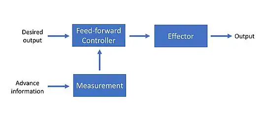 In feedforward control systems, additional input is used in order to calculate the necessary control signal that will lead to the desired output. No direct feedback from the output stage is necessary for the process, which makes the feedforward control system generally faster than the feedback system.