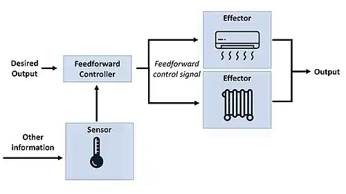 An extended thermostat example of a feedforward control system. A desired output is set manually – e.g. 22 degrees Celsius. Next to the current temperature, the comparator receives many different types of information, e.g. room size, humidity or the number of people in the room. This information would then be sufficient to turn on the furnace or air conditioner for a given period of time. The amount of time necessary would be subject to long periods of training.