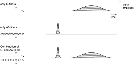 Pain consists of a sharp pinprick sensation due to the fast Aδ-fibers, followed by a diffuse burning-like sensation due to the slower C-fibers