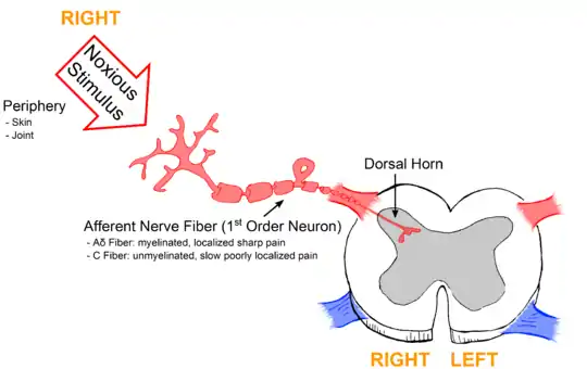 Next, free nerve endings called nociceptors will be activated by the noxious stimulus. They transduce the stimuli to electrical signals which will then be passed on through the afferent nerve fibers to the dorsal horn of the spinal cord.