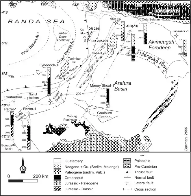 The Akimeugah Foredeep is located north of a basement high (the Merauke Ridge) which separates it from the Arafura Basin to the south. The basin is a foreland basin located partially onshore and offshore eastern Irian Jaya. The Quaternary (Buru Formation) exceeds 3500 m thickness in the basin which was formed following uplift during the Melanesian Orogeny in post-Miocene times. Poorly delineated, foreland sediments may overlie Paleozoic or Mesozoic platform sequences with the Jurassic-Cretaceous Lower Kembelangan Formation thinning across the Merauke Ridge.