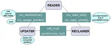 Another synchronization mechanism that solves the readers–writers problem is the read-copy-update (RCU) algorithm. Read-copy-update implements a kind of mutual exclusion that is wait-free (non-blocking) for readers, allowing extremely low overhead. However, RCU updates can be expensive, as they must leave the old versions of the data structure in place to accommodate pre-existing readers.