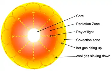 Convection zone: Have you ever seen the air shimmer above a fire? Perhaps you've been told it's because heat rises? Actually, it is the hot air that is rising. Hot gases get less dense and rise. Cold gases get denser and sink. In this zone, the gases are less dense. They behave like air in a fireplace. Gas at the bottom of the zone gets heated up from below. It rises to the surface, gives off its heat to space, and sinks again. The gas in the convection zone forms currents like those in Earth’s oceans and atmosphere. The currents are called convection cells.