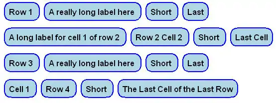 In the example above we note that the widths of each cell is determined by the size of the label. Each cell can have a different label. Note that we create a wrapper for each cell using a div. Both the cell wrapper and the .xf-fepeat-item must be set to be display:inline.