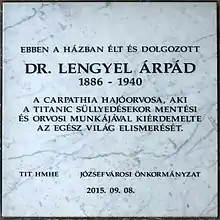 The shipping company assigned Lengyel to the RMS Carpathia as ship's doctor for third class passengers. He signed his employment contract on 19 March 1912. His first voyage on board the ship was the Rijeka-New York-Rijeka line. Carpathia sailed into New York on 29 March and returned to Rijeka twelve days later with 725 people on board. Passengers included both Hungarians returning to their homeland or visiting, and wealthy Americans, mainly in first class, on European excursions. Carpathia's voyage to Rijeka was uneventful until the early hours of 15 April 1912. At 0.25 a.m., however, Carpathia radio operator Harold Cottam picked up a distress call from the RMS Titanic, which had struck an iceberg and was then 58 nautical miles (93;km) from Carpathia. Captain Arthur Rostron immediately gave the order for the ship to change course and set sail to rescue the Titanic's passengers. Captain Rostron decided that the survivors should be hoisted aboard the ship through the between-deck entrance nearest the waterline. The captain put Árpád Lengyel in charge of the rescue, as he was the only one of the three doctors with experience as a paramedic.[3] All the survivors were in a state of shock, unable to grip the rope ladders lowered from the hatchway with their frozen, numb hands. One by one, the survivors were pulled up to the hold with the help of pulleys. Lengyel met the survivors at the entrance to the hold and performed a quick initial diagnosis, on the basis of which the men were escorted to the prepared first aid stations, so he met all the 710 survivors. In his memoirs, Árpád Lengyel wrote: "We could hardly cope with all the work and consolation. It was horrible to see all these people, women screaming for their husbands and children who were lost before their eyes, and here and there lonely children who had lost their parents. We comforted the poor with sobbing hearts... It was a very sad journey back (to New York), with only weeping and wailing everywhere..."[1][4]