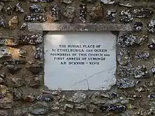 Æthelburh of Kent (born c. 601,[1] sometimes spelled Æthelburg, Ethelburga, Æthelburga; Old English: Æþelburh, Æðelburh, Æðilburh, also known as Tate or Tata),[2][3] was an early Anglo-Saxon queen consort of Northumbria, the second wife of King Edwin. As she was a Christian from Kent, their marriage triggered the initial phase of the conversion of the pagan north of England to Christianity.