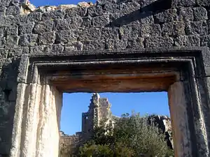 Although the ruins are scattered around, only three building are partially standing. The building just next to the road is thought to be an early Byzantine church. Two walls as well as the apse are standing. The Hellenistic temple is further to west and located on a hill. It is a temple of Hermes, the Greek god of transitions. Partially rock carved, four walls and a staircase are standing. On the wall there is a relief of Caduceus. There is another building which was probably a tower to the south of the temple. There are also ruins of cisterns, sepulchers etc. around.[2]