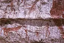 Detail of the mural showing the hind part of the aurochs, a deer and hunters.