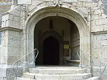 The Église Sainte-Geneviève de Loqueffret is a Roman Catholic parish church located at Loqueffret, situated in the arrondissement of Châteaulin and the department of Finistère in Brittany in north-western France. The parish church of Loqueffret was built in granite in the Gothic style in the 16th century and is dedicated to Saint Geneviève, a 10th-century Breton saint. The calvary dates to the 15th century. The existing bell-tower dates to 1771 and the bell-tower spire was designed by the architect Joseph Bigot and dates to 1850. The church has two large entrances on the west and south side.[1][2]
