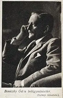 Ödön Beniczky de Benice et Micsinye (12 February 1878 20 January 1931) was a Hungarian legitimist politician, who served as Interior Minister between 1919 and 1920. He was a resolute adversary of Governor Miklós Horthy. He supported the king Charles IV in the king's attempts to retake the throne of Hungary. That is why Beniczky was arrested for a short time. He published his statement before the military public prosecutor's department in his newspaper ("Az Újság") about the White Terror. He was also arrested for two years. Beniczky's case was a huge scandal in Hungary, but the legitimists didn't use these happenings against the governor.