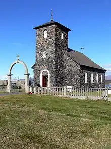 Ásgeir Einarsson (1809–1885) was largely responsible for the church's construction. Einarsson was a local farmer and a member of Icelandic Parliament ( Alþingi). Construction of the church took 13 years and required transporting stone from Nesbjörg throughout the winter of 1864–65, by sled over the ice-covered lake Hóp on an 8-km journey. Stonemason Sverrir Runólfsson assisted with the planning and built the church walls. Each stone used was put in stowage or tied down and also glued with chalk, and the stones have not moved to this day.[3][4]
