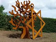 In September 1952, the Union of Jewish Communities of Yugoslavia unveiled five monuments to the victims of the Holocaust in Belgrade, Zagreb, Sarajevo, Novi Sad and Đakovo.[38] Following Croatia's independence from Yugoslavia, the former campsite was turned into a gas station.[39] A commemorative ceremony is held at the site every year on the first Sunday in June. The commemoration also encompasses the nearby cemetery in which the camp detainees who died were buried. The cemetery is unique in that it is the only burial site in Europe where victims of the Holocaust were interred under their first and last names and not merely their inmate number.[40] There are 569 camp victims buried in the cemetery.[26] On this basis, the historians Jens Hoppe and Alexander Korb have concluded that the camp's mortality rate amounted to nearly 19 percent.[19] In June 2013, a sculpture titled Peace in Heaven, by Croatian-born Israeli sculptor Dina Merhav, was unveiled in Đakovo to commemorate those who were interned at the camp.[41]