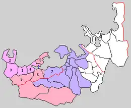 * yellow - areas formerly within the district borders during the early Meiji period