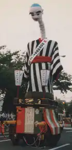 - The ōnyūdō that rides above the festival float about 2.2 meters tall has a body height of about 3.9 meters and a crooked neck with a length of about 2.2 meters before extension, and it is a large mechanical doll that can stick out its tongue and change its eyeball. Imitating this, a paper doll of the ōnyūdō with an extendable neck is also a souvenir of the local area. It is also put out in the citizen festival, the Daiyokkaichi Festival that takes place in August of every year among others, and has become a symbol character of Yokkaichi.