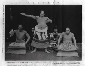 At the time of his makuuchi debut in 1909, he was one of the last rikishi to compete in the Ekō-in temple before the opening of the old Ryōgoku Kokugikan.[3] During his first makuuchi tournament he was surprisingly paired against ōzeki Komagatake but managed to score a surprise victory.[3] Ōtori knew a rapid ascent. He was promoted to san'yaku twice (in 1910 and 1911), but was rebuffed both times. In 1913 he was promoted to the second highest rank in professional sumo, ōzeki, becoming the first wrestler from Chiba Prefecture to be promoted at that rank since the promotion of his master Hōō in 1897.[4] Ōtori won his first tournament championship in his debut tournament at the rank of ōzeki in January 1913. He was undefeated in that tournament, recording seven wins, one draw and one no decision. His second championship in January 1915, which he took with ten straight wins, saw him promoted to yokozuna. His promotion was subject to debate within the Japan Sumo Association as the Yoshida family refused him the promotion, arguing it was premature and that the promotion should be put on hold for one more tournament, but the Association pushed through, and Ōtori was given a yokozuna license.[3] Ōkuma Shigenobu presented him a tachi, or long sword, to use during his yokozuna dohyō-iri.[5]