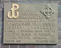 Plaque to commemorate soldiers of the Żaglowiec Group, placed in the point of concentration of its units on 1 August 1944 on Dymińska 10 street in Warsaw.
