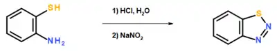 1,2,3-Benzothiadiazole is readily prepared by the diazotisation reaction of 2-aminothiophenol or its disulfide with sodium nitrite, as originally reported in 1887[2] and reviewed in several subsequent publications.[3][4][5][6]