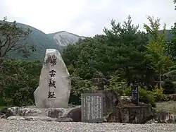 A monument of the Kaerikumo Castle, buried by an earthquake-triggered landslide. The landslide scar is visible in the background.
