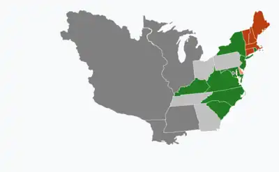 1804 presidential election results. Green denotes states won by Jefferson, burnt orange denotes states won by Pinckney. Numbers indicate the number of electoral votes allotted to each state.