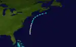 Late on August 31, a Category 1 hurricane with maximum sustained winds of 80 mph (130 km/h) was reported over the Central Atlantic. Moving generally north to north-northeast, the storm gained no intensity over the next day or so as it passed between the United States East Coast and Bermuda. Late on September 2, the storm retained tropical storm status as it paralleled the coast of Washington, D.C. Retracing to the east at an increasing forward speed, the storm system held its intensity of 70 mph (110 km/h) for the rest of its existence. Observations from the ship Helen R. Cooper confirm that this storm was in fact a hurricane.[3]