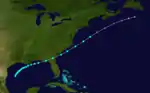 The final known hurricane of the season was observed on October 15, to the northeast of the central Bahamas. The ship "Jim Cow", en route from New York to Panama, suffered heavy damage from the storm, so much that it could not complete its voyage. Moving generally northeastward, the hurricane was estimated to have reached peak winds of 105 mph (169 km/h), based on ship reports. On October 17 the cyclone was absorbed by a rapidly intensifying extratropical cyclone off the coast of New England. It never affected land.[2][1]