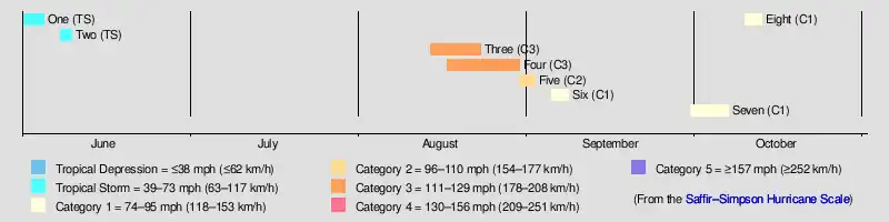 | Four | August 17–30 | Category 3 hurricane | 115 (185) | 962 | Leeward Islands, The Bahamas, Florida | Unknown | 27 | |||