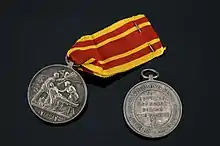A silver medal was struck "in honor of those who assisted in the cleaning up of Tai Ping Shan." On the obverse, a scene of the epidemic was engraved. On the reverse were the inscriptions "For services rendered during the Plague of 1894" and "Presented by the Hong Kong community."[57][77]