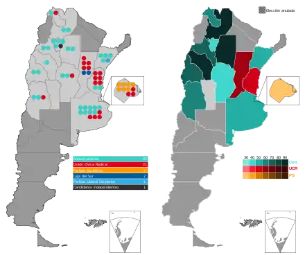 Amid somewhat lower turnout, results were mixed: The UCR continued to make gains in the Chamber of Deputies, the lower house of Argentina's National Congress, electing 19 of the 60 seats at stake. They fared particularly well in Entre Ríos and Santa Fe Province, in which latter they received more than twice the votes of Santa Fe native Lisandro de la Torre's Southern League. The Socialist Party again defeated the UCR in the City of Buenos Aires, however, and by a wider margin than in 1913. Conservative Buenos Aires Province lawmaker Marcelino Ugarte, who had defeated the UCR in the 1913 Senate race, did so again in this year's gubernatorial contest, and became his party's effective leader. The Civic Union, representing those who broke from the UCR after its 1890 founding, continued to erode in influence, and following these elections, Honorio Pueyrredón announced its reunification with the UCR.[3]
