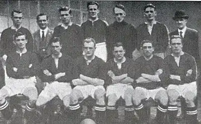 Back row: John Hampson, Tom Holford (trainer), Jack Maddock, Alf Dark, Thomas Lonsdale, Len Birks, Joe Schofield (manager)