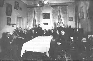 ![]() The leaders of the coup in the house of General Ivan Rusev (the image has been restored). From left to right: Dimo Kazasov, Kimon Georgiev, Nikola Rachev, Yanaki Mollov, Ivan Valkov, Aleksandar Tsankov, Khristo Kalfov, Ivan Rusev, Petar Todorov, Tsvetko Boboshevski. | |||||||