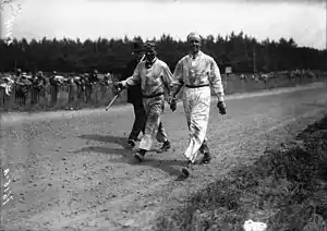 From the rolling start Bordino came from the second row to lead at the first corner. De Vizcaya misjudged his braking in the new Bugatti and careered off the road and through a fence. Sixteen spectators were injured.[13] The race soon separated into two competitions: Fiat versus Sunbeam at the front and Bugatti versus Voisin further back. Bordino impressed many with his bravery and speed and led for nine laps until waylaid by engine problems: the supercharger was too close to the road and had sucked stones and dust into the engine. Guinness took the lead pursued by Giaccone. Then the Sunbeam's clutch began slipping and they had to stop to tie a rope to pull it. Dropping to sixth he then had to stop again as his mechanic had been knocked unconscious by stones when putting his head out to pull the rope. Meanwhile, Giaccone had taken the lead until he too was stopped, on the 16th lap, by the same supercharger issue as his teammate Bordino.[26][9]