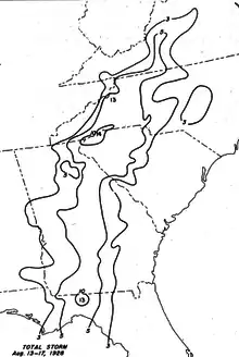 In North Carolina, rainfall caused the Catawba, French Broad, Swannanoa, and Yadkin rivers to overflow their banks. Many nearby homes and structures were swept away.[13] Families along the South Pacolet River near Tryon were evacuated. Additionally, two shelters were set up in Asheville, one at a Salvation Army post and another at the municipal auditorium, where hundreds of cots were set-up. A mudslide near Asheville moved across a railroad track, blocking the route to locomotive traffic.[9] Several feet of water covered highways near Marshall, leaving many roads impassable. Extensive crop losses also occurred in western North Carolina, with agricultural losses reaching $250,000 in Burke County alone.[13] Six people were killed in the state, of which four due to flooding and two others from a tornado in Ashley Heights.[13] Property damage totaled over $1 million.[14] Rainfall from both the previous hurricane and this storm brought flooding to Virginia. Major flooding was reported along the Roanoke River from Brookneal to Roanoke. At the former, the river crested at 14 ft (4.3 m) above flood stage.[15] In Altavista, crops were ruined and 11 buildings were flooded. Route 17 north of Fincastle was inundated, blocking traffic between Clifton Forge and Covington. Two deaths occurred in Virginia, one from drowning and another from fright while crossing the Roanoke River.[13]