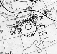 A westward-moving tropical wave developed into a tropical depression while situated near Tobago on August 7. Initially, the storm was considered a "disturbance of slight to moderate intensity". Moving northwestward, the system passed through the Windward Islands just south of Carriacou and Petite Martinique. Upon entering the Caribbean Sea early on August 8, a ship reported winds of 46 mph (74 km/h). As a result, HURDAT indicates that the depression became a tropical storm at 00:00 UTC. On August 9, the storm strengthened into a Category 1 hurricane on the modern-day Saffir–Simpson hurricane wind scale, while located about 155 mi (249 km) south of San Pedro de Macorís, Dominican Republic. At 12:00 UTC on August 10, the cyclone attained its peak intensity as strong Category 1 hurricane with maximum sustained winds with winds of 90 mph (140 km/h) and a minimum barometric pressure of 998 mbar (29.5 inHg). Early on August 9, the storm made landfall in the Tiburon Peninsula of Haiti, based on "belated reports [indicating] that a very small but destructive disturbance passed over extreme southwest Haiti". The quickly re-emerged into the Caribbean Sea later that day.[1]