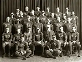 Center Chuck Bernard and end Ted Petoskey were also selected as first-team All-Americans by some selectors.[3][4][5][6] The team captain, Ivy Williamson, was selected as a second-team All-American in the Central Press Association's captains poll.[7] Gerald Ford, who later became the 38th President of the United States, was the back-up center on the team and won the Meyer Morton Award as the most improved player in spring practice.