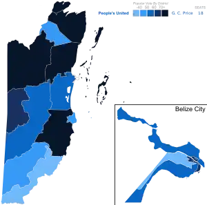 ![]() Popular vote by constituency. As Belize uses the FPTP electoral system, seat totals are not determined by popular vote, but instead via results by each constituency | ||||||||||||||||||||||||||||||||||