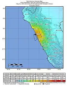- 1 2 Cluff, L.S. (1971), "Peru earthquake of May 31, 1970; Engineering geology observations" (PDF), Bulletin of the Seismological Society of America, 61 (3): 514, Bibcode:1971BuSSA..61..511C, doi:10.1785/BSSA0610030511, S2CID 132218116