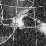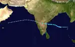 The monsoon trough spawned a tropical depression on November 14. It tracked westward, becoming a tropical storm on the November 15 and a cyclone on November 16. A break in the subtropical ridge pulled the cyclone northward, where it slowly strengthened to a peak of 125 mph winds. It hit the Andhra Pradesh coastline on November 19 at that intensity, and dissipated the next day. Strong winds, heavy flooding, and storm surge of 5 meters high killed 10,000 people,[9] left hundreds of thousands homeless, killed 40,000 cattle.[10] and destroyed 40% of India's food grains.