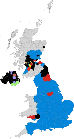 The Conservative Party gained 1,293 seats, bringing their number of councillors to 12,370. The Labour Party lost 1,098 seats, leaving them with 7,115 councillors. The Liberal Party lost 163 seats, leaving them with 950 councillors.