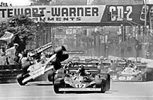 The McLaren driven by James Hunt almost in the air and close to Carlos Reutemann's Ferrari (#12) with the rest of the racers behind them