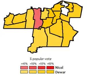 Marion Dewar swept the city in her re-election, winning all but one ward. Her best results came in the city's urban wards, with her best ward being Capital, where she won 63.4 per cent of the vote. She also topped 60 per cent in By-Rideau, St. George's and Capital wards. Her only loss was in Elmdale, which Nicol won narrowly by 43 votes. Nicol represented Elmdale on city council.[1]