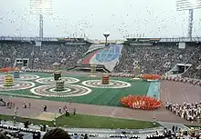 • Finale: Performers from throughout the opening ceremony re-entered the stadium as the Moscow Olympics' theme song "Moscow Gives the Start" (Старт даёт Москва, Start dayot Moskva) was sung, and would later exit again. Balloons were released. The card stunt at this time was showing the Moscow 1980 Olympic logo.